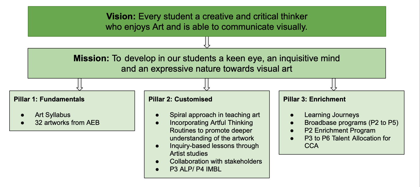 The learning content is enhanced through customising its curriculum to include Inquiry-Based Learning, Choice-Based Art Classrooms, Interdisciplinary Museum Based Learning and Cultural Art Studies across the different levels. Our school also adopts the Artful Thinking Routines for art discussions.